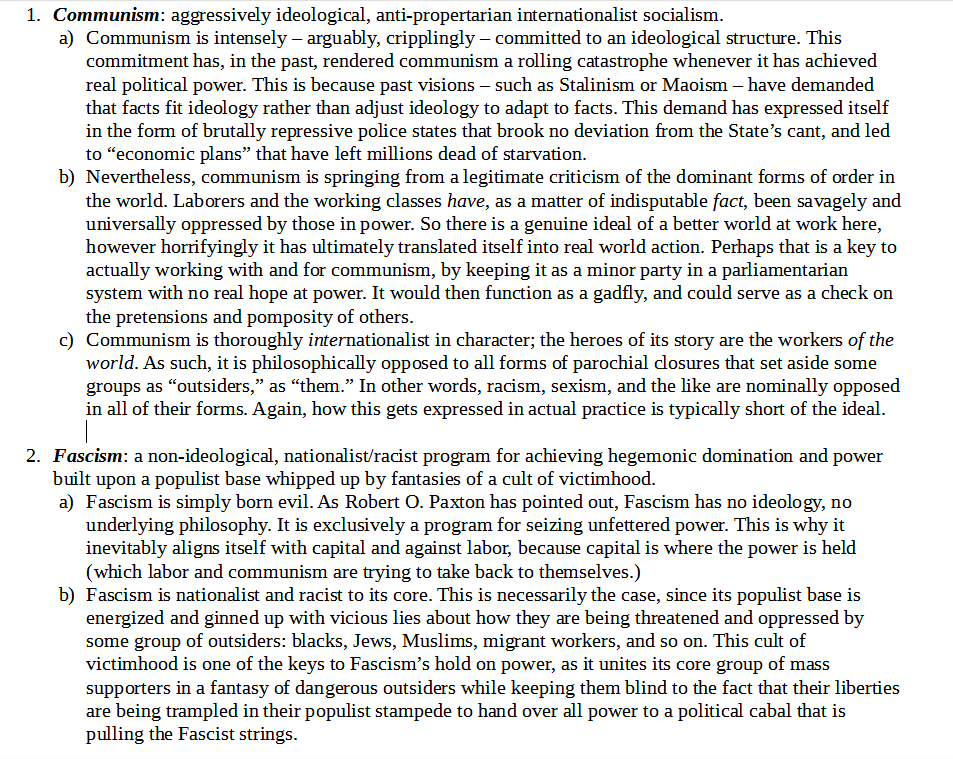 A reminder for those who don’t want to go back and read those earlier posts, fascism is: