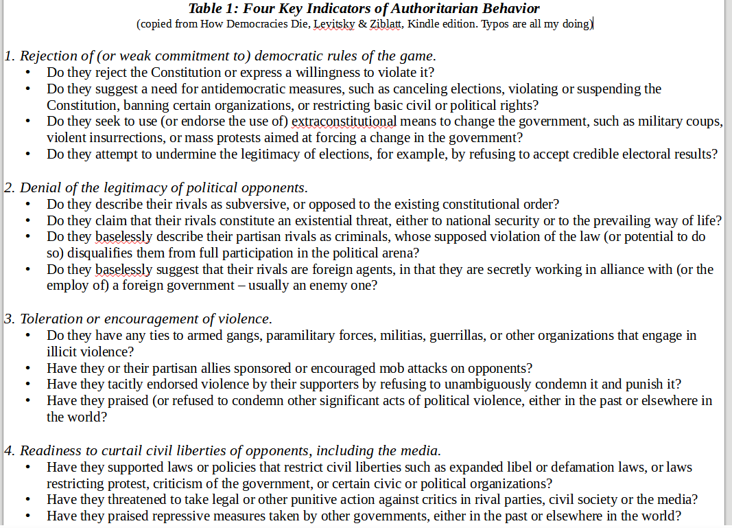 Yeah, so, I fucking told you so. The professional, “adult” way of saying that is something like, “events have evolved along the patterns we previously anticipated”, but I’m fucking done with being an “adult”. I told you that Trump was a fucking fascist; I told you more than once. Ironically enough (assuming I’m using the term “ironically” correctly, which assumption may itself be a bit ironic) Robert O. Paxton, the scholar upon whose work I lean most heavily for my understanding of fascism, was quite slow in acknowledging the fact that Trump is a fascist. The last straw for Paxton was Trump’s ginning up the mob on January 6th in his (previous) last ditch attempt to overthrow the government. It was the invocation of the mob that turned Paxton’s opinion, but Paxton is (I am arguing) in error on this matter. J6 was the time Jabba-the-Trump succeeded in ginning up the mob, it is scarcely the first or only time he made such an attempt or appeal. Trump was and is constantly calling for mob action, whether in the form of beating up someone he dislikes, or more general intimidation tactics. Stochastic terrorism is Jabba’s bread-and-butter. J6 stands out not because it was the first time Jabba made such a call; it stands out because it was the time the mob actually turned out en masse. And as Paxton himself astutely notes, it is not success that makes a fascist movement fascist, it is the fascism itself; the intent, not the achievement.