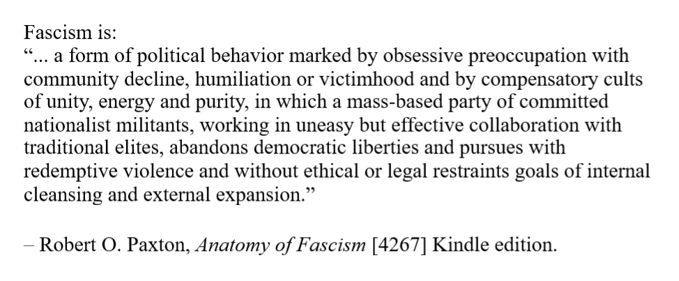… a form of political behavior marked by obsessive preoccupation with community decline, humiliation or victimhood and by compensatory cults of unity, energy and purity, in which a mass-based party of committed nationalist militants, working in uneasy but effective collaboration with traditional elites, abandons democratic liberties and pursues with redemptive violence and without ethical or legal restraints goals of internal cleansing and external expansion.